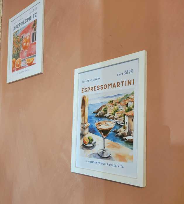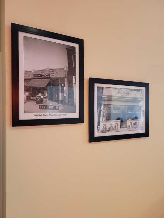 Since then, Lampropoulou decided to venture out on her own with the opening of Koukla. Her vision was for an espresso bar like the ones she experienced in Italy and Greece, which offer more than just a space to grab coffee and rush to work; instead, guests are invited to slow down and savor food and drink, whether they come alone or with friends. The space is adorned with furniture from Greece and artwork from Italy, featuring salmon and cream-colored walls, as well as photos of her favorite places in Greece. An old photo also shows the space’s original business, an ice cream shop from the 1930s, next to a photo of the newly opened cafe.