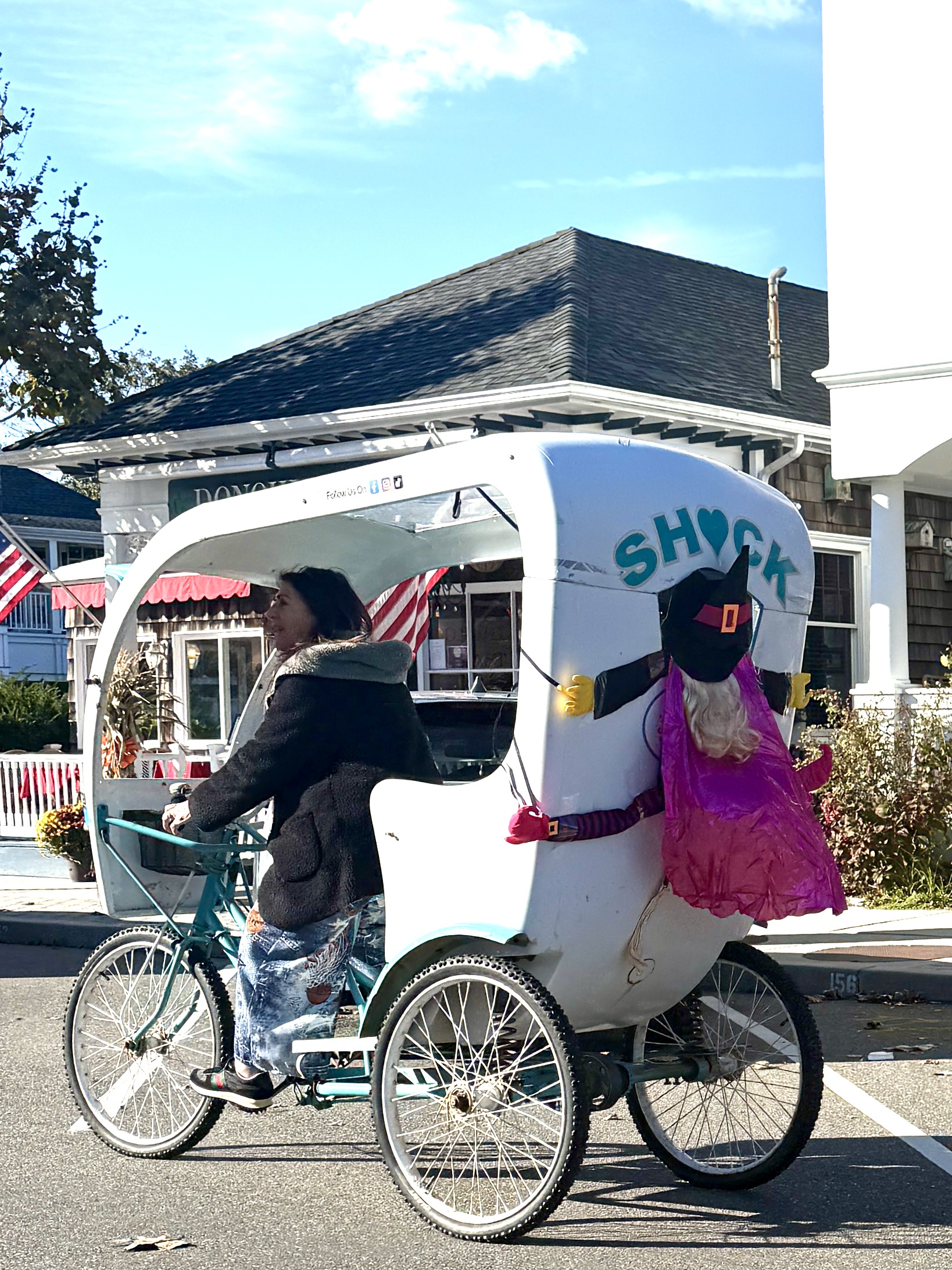 Elyse Richmond, the owner of Shock, peddles her message on Westhampton Beach’s Main Street.
