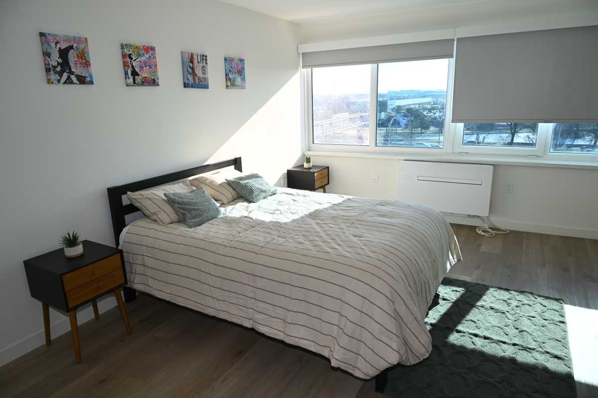 The building, originally constructed as a 350-room hotel in 1987, was designed with plenty of windows that offer natural light and sweeping views of JFK airport and Jamaica Bay. Rooms with compatible layouts were then combined to create apartments with separate bedrooms.