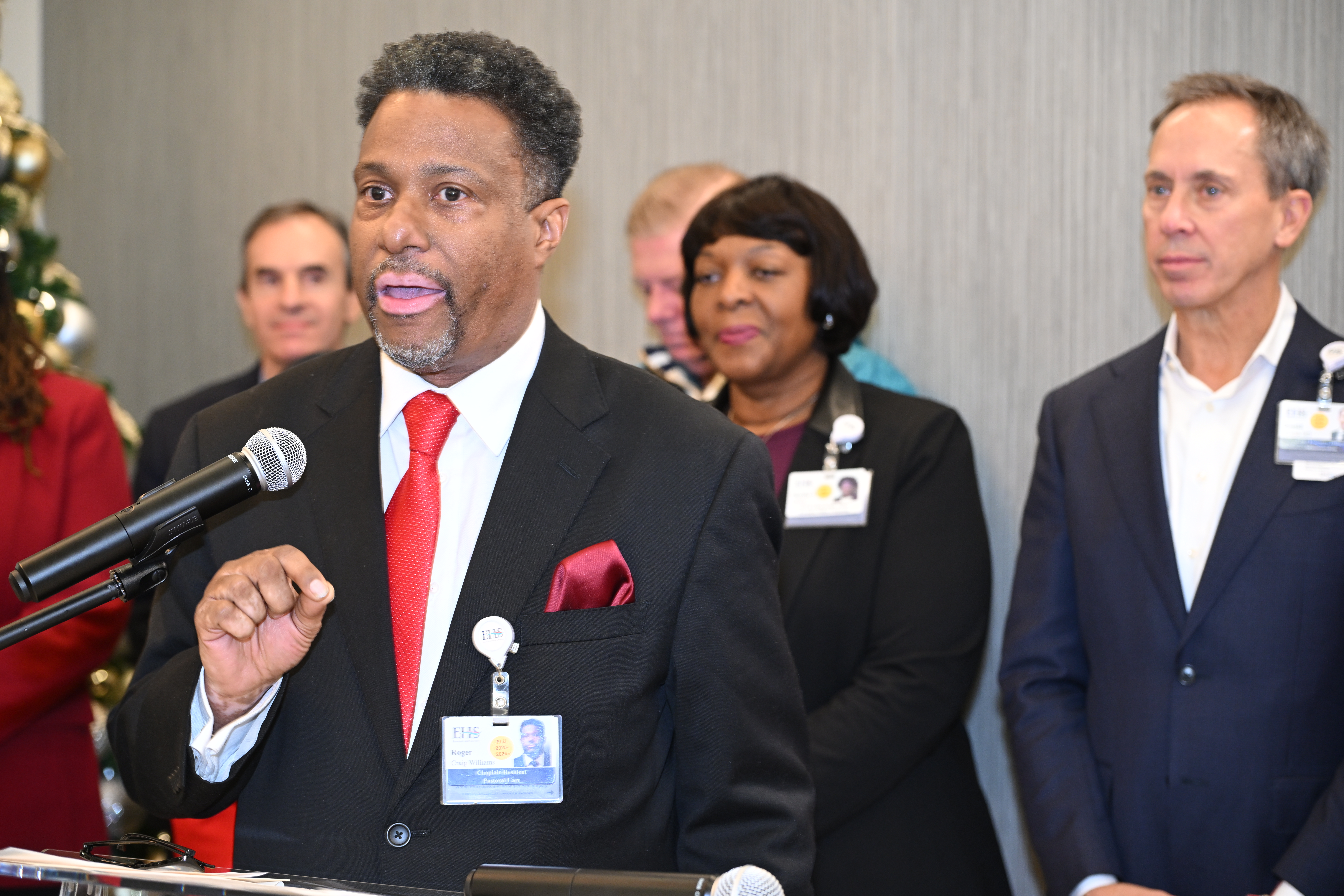 “Today we celebrate not just the stunning lights that will soon adorn this tree, but also the spirit of togetherness and hope that shines within our hearts. As we gather here for this festive occasion, let us remember the importance of connection. Connections with our loved ones, our neighbors and especially the incredible members of our EHS team,” Guerrier said. “As we light this tree, let it symbolize our shared hopes and dreams for the coming year. May it remind us to carry forward the values of love, kindness and empathy, not just during the holiday season, but every single day. As the lights illuminate our surroundings, let them also brighten our spirits and spark joy in our hearts. Together, we will create a tapestry of support, inspiration and community.”