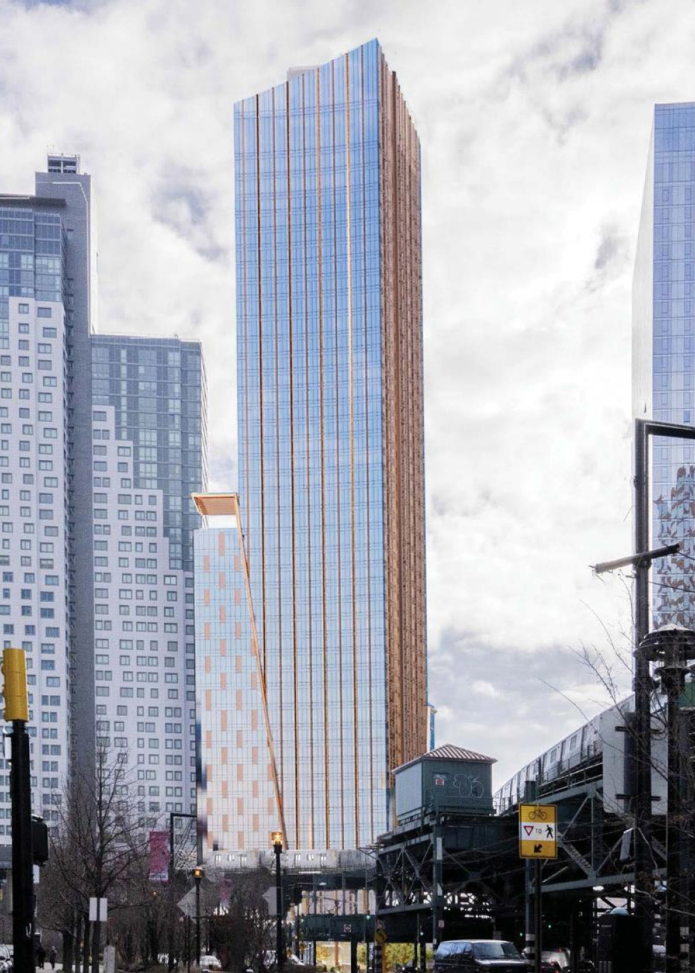 Based on the new renderings, the height of the tower will be run by a reflective glass curtain wall with vertical strips of copper-hued paneling. The northern and eastern corners of the massing incorporate angular volumes that slope upward to staggered setbacks. A checkerboard pattern of bronze-hued paneling is expected to make up the shorter northern portion’s cladding. The tower itself will be topped off with a mechanical bulkhead on an angled crown.