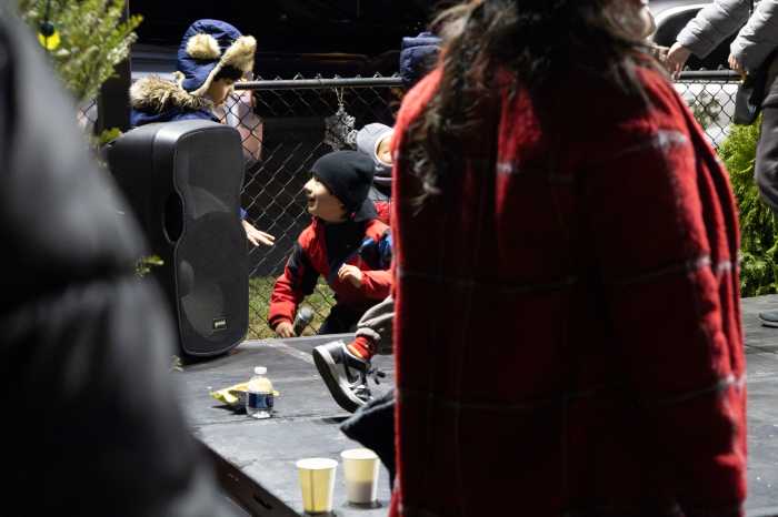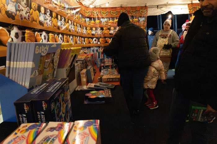 Each child received a toy from an array of tables that offered a wide variety of selections like coloring books, stuffed animals, dolls and more. The toy giveaway is a special part of Ozone Park’s tree lighting ceremony, as just a few blocks away is the Ozone Park Inn, a hotel that provides shelter to over 100 families experiencing homelessness. Many of the families have small children, who could be seen dancing on stage to music, sitting atop shoulders to see the tree and sipping their hot cocoa to fend off the cold.