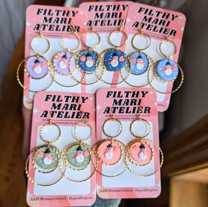 Filthy Mari Atelier is a Queens-based brand that sells handmade polymer clay earrings. The brand offers an array of adorable and unique jewelry, featuring special holiday themes such as neon-colored Christmas trees, Christmas fortune cookies and more. The one-of-a-kind earrings are a perfect holiday gift, available for sale on Etsy or nearby pop-up shops in the area.