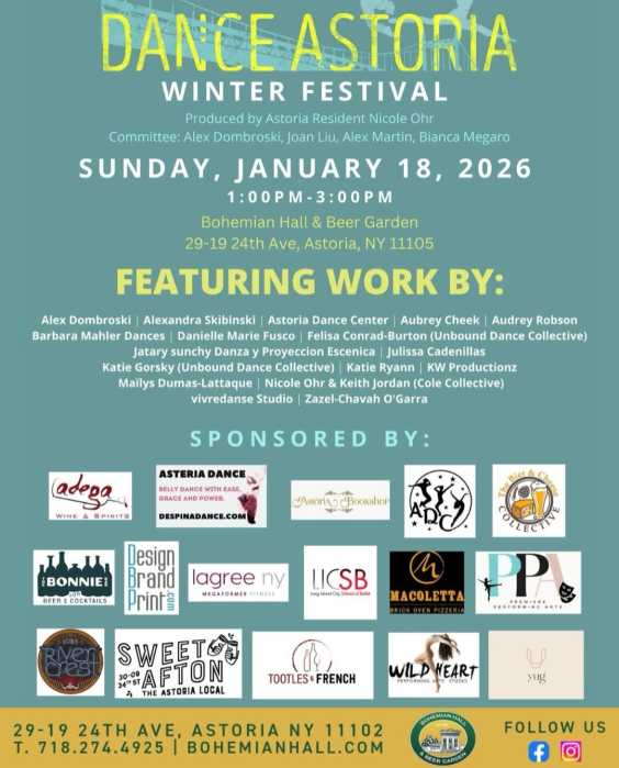 The festival, which will take place at Bohemian Hall and Beer Garden, located at 29-19 24th Ave. in Astoria, on Sunday, Jan. 18, from 1-3 p.m. showcases the diversity of the Queens dance scene with a lineup of tap, hip-hop, contemporary, jazz, and more. Whether you love dance or are just looking for a family-friendly way to spend the afternoon, the event is filled with lively energy, dance, music, and community.