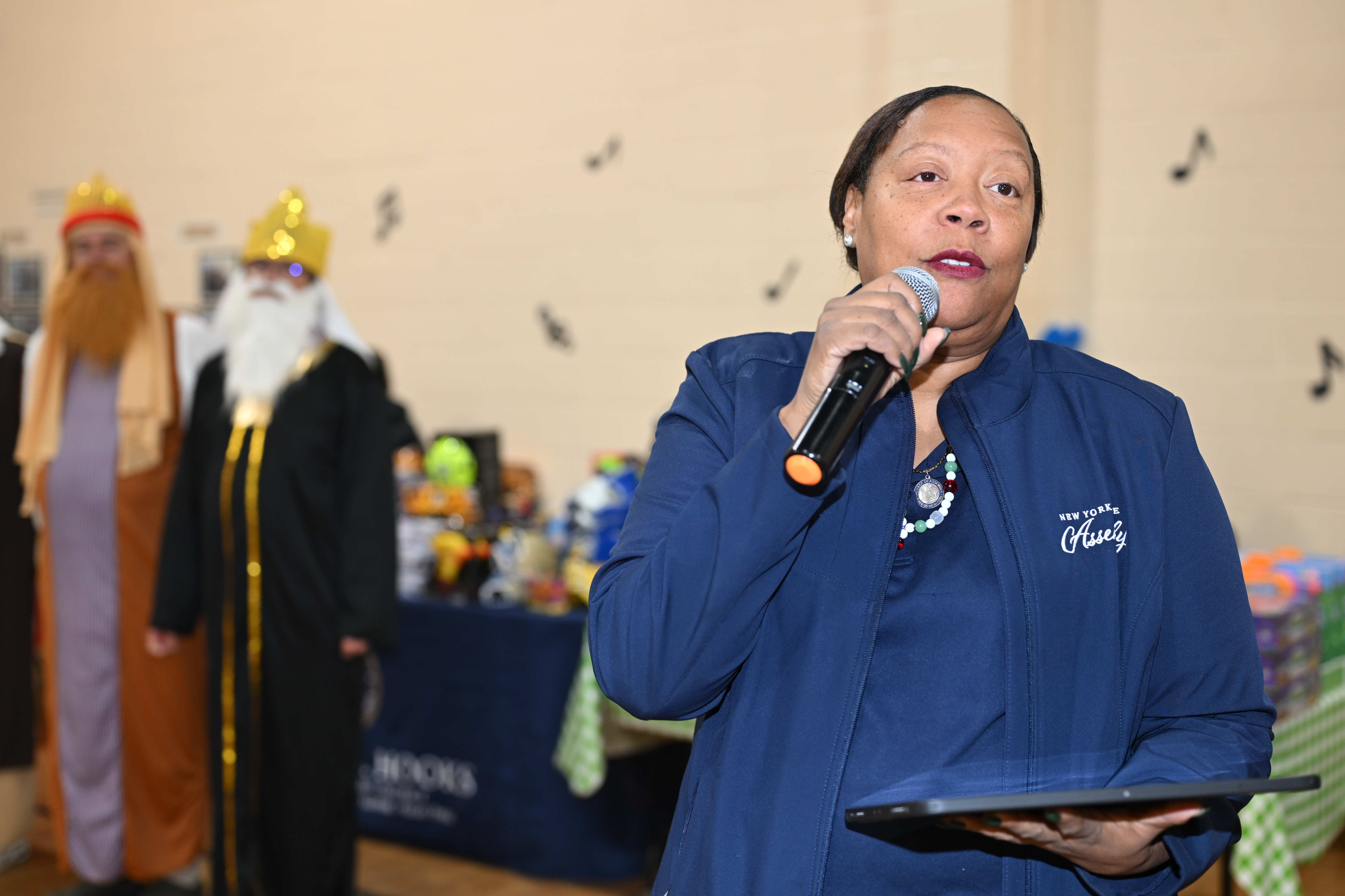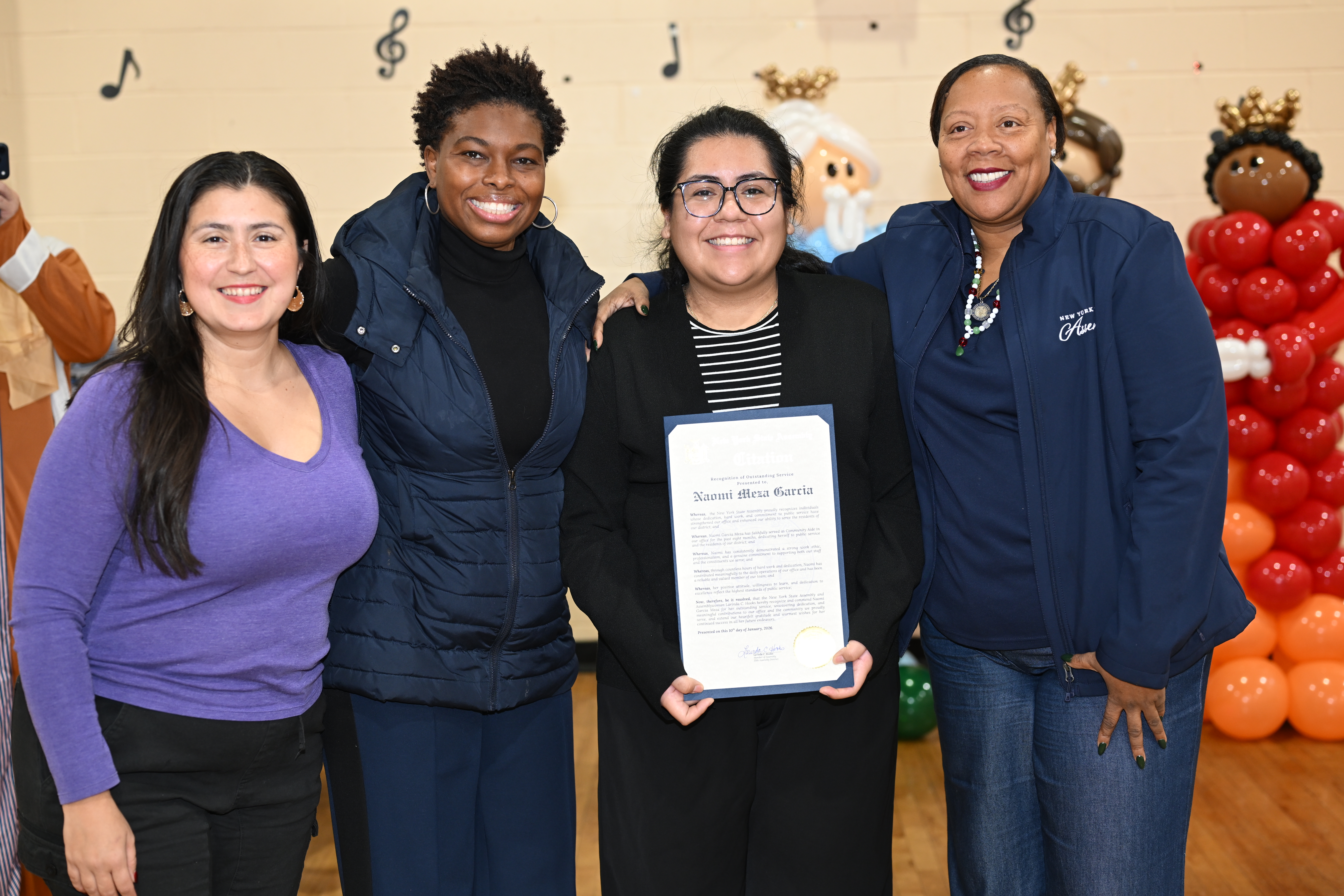 State Senator Jessica Ramos speaks at the Three Kings Day celebration. Photo by Ramy MahmoudState Senator Jessica Ramos (left), Council Member Shanel Thomas Henry (second from left) and Assemblymember Larinda Hooks (right) presented a certificate of recognition at the event to Naomi Meza Garcia (second from right) for her hard work and dedication as a community aide in Hooks’ office. Photo by Ramy Mahmoud