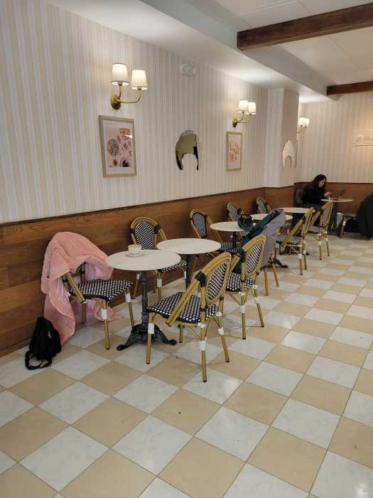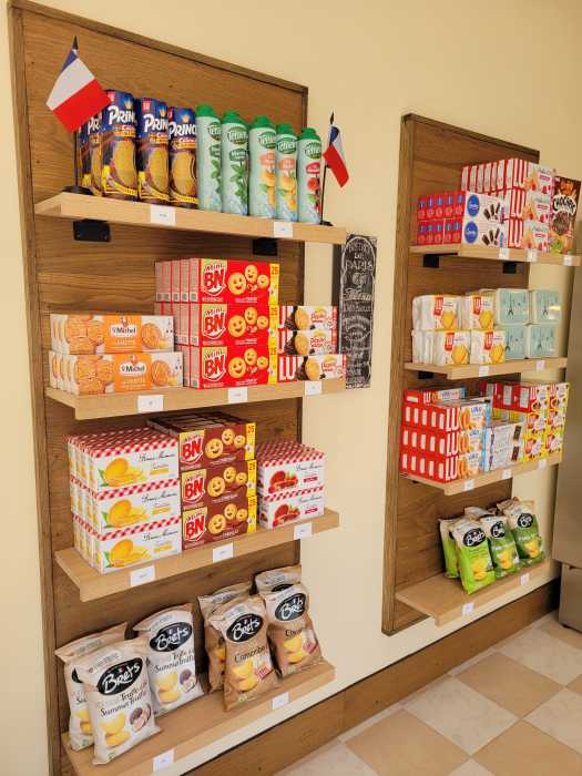 For those looking for something savory, they have items like the ham and swiss croissant, quiche mushroom spinach, and sandwiches perfect for any time of day, like their bacon egg and cheese on a croissant, made with gruyere cheese, bacon and eggs, and sandwiches on baguettes like the Jambon Beurre, made with Jambon de Paris, butter, and gruyere cheese. Their beverages include classic drinks such as espresso and cappuccinos, as well as special lattes like rose, pistachio or matcha. For those looking to explore French grocery items, a section at the front features special products, including French potato chips, biscuits, and breakfast items, among others. The atmosphere of the space definitely gives guests an escape to France from its authentic preparation and ingredients, to the music and decor.