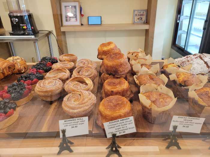 Other pastries to explore when visiting the shop include the Kouign Amann, made with croissant-style dough and baked with butter and sugar for a caramelized finish, and the mixed berry tart, prepared on a croissant shell and filled with vanilla pastry cream and fresh fruits, such as raspberries, blackberries, and strawberries.