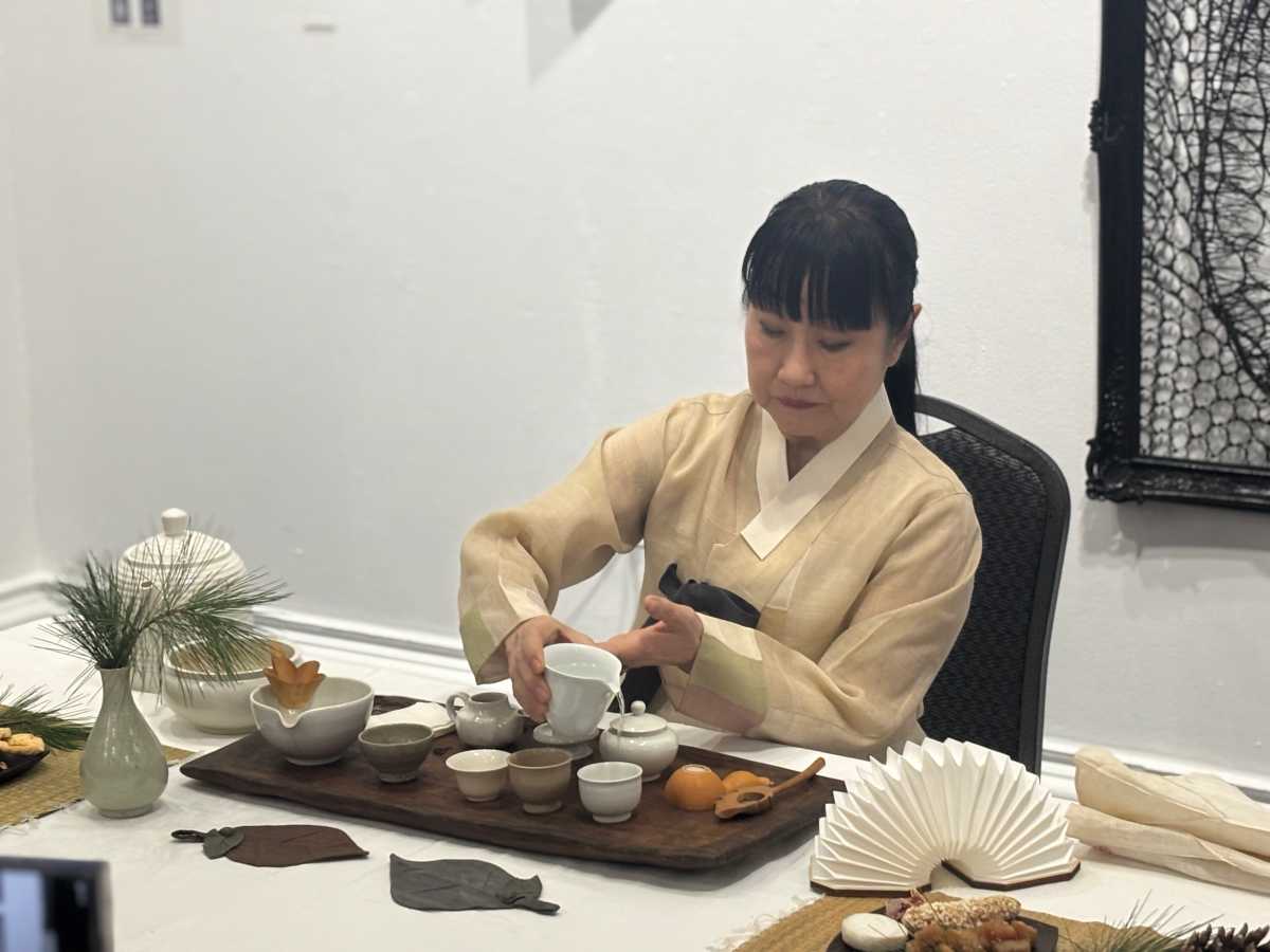 Chun sat at a prepared table in the gallery as guests watched her carefully and meticulously brew Korean tea and pour it into each teacup, one at a time.