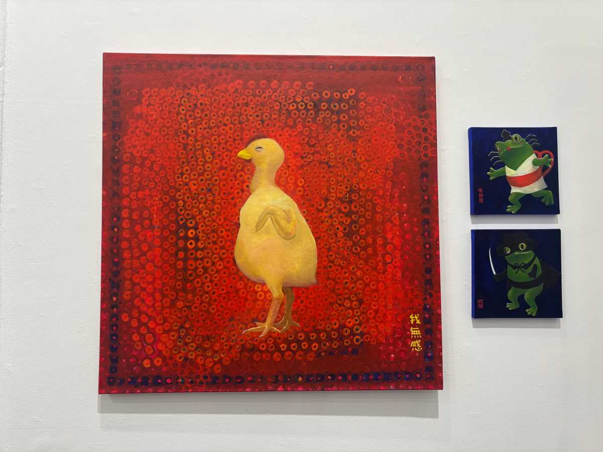 Two of her paintings stacked on top of each other at the exhibit feature a frog dressed as a Kabuki performer — a Japanese performing art only featuring men who dress in drag — and a frog dressed as Zorro wielding a knife. “The froggy likes to pretend to be somebody else,” Chizuco said, laughing.