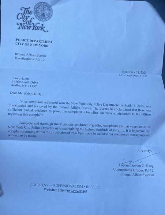 Kiely cites the lack of urgency as an example of the NYPD’s priorities in Malba, with advocates and politicians requesting that the neighborhood, Whitestone and College Point be given their own precinct, as the 109th Precinct dedicates most of its resources to Flushing. Kiely had complained after the swatting incident and, shortly after the Malba riot that saw a much lighter police response than her own case, received a letter from the Internal Affairs Bureau (IAB) stating her complaint against the precinct and her daughter’s uncle had “sufficient partial evidence” of adverse actions towards her and a “command discipline” had been administered. A command discipline could mean the loss of up to 10 vacation days, depending on its schedule, as well as oral admonishment.
