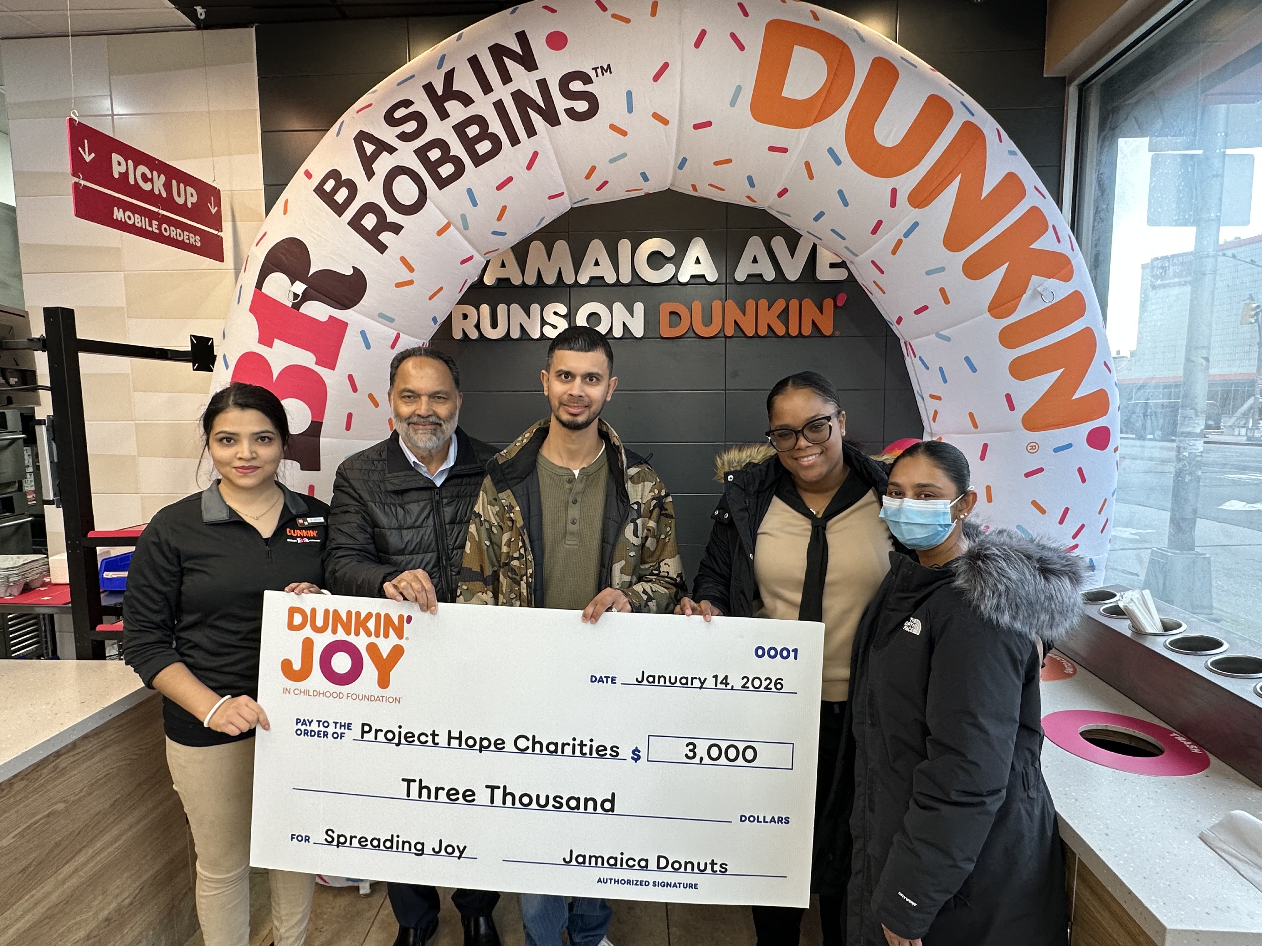 To commemorate the grand reopening, Dunkin’ franchisee Jamaica Donuts announced a $3,000 donation to Project Hope Charities, in conjunction with the Dunkin’ Joy in Childhood Foundation. The donation will help Project Hope Charities fulfill its mission of providing a wide range of services to the poor, low-income, working poor and homeless in the Jamaica community and the Greater New York City area.