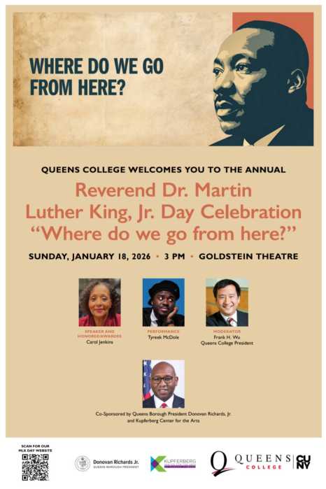 This year’s theme of the decade long annual event will be, “Where do we go from here?” moderated by President Frank H. Wu including a speech by Queens Borough President Donovan Richards, Jr., and a keynote address from Carol Jenkins, a journalist, author, and civil rights advocate, who is the 2026 recipient of the Queens College Reverend Dr. Martin Luther King Jr. Award.