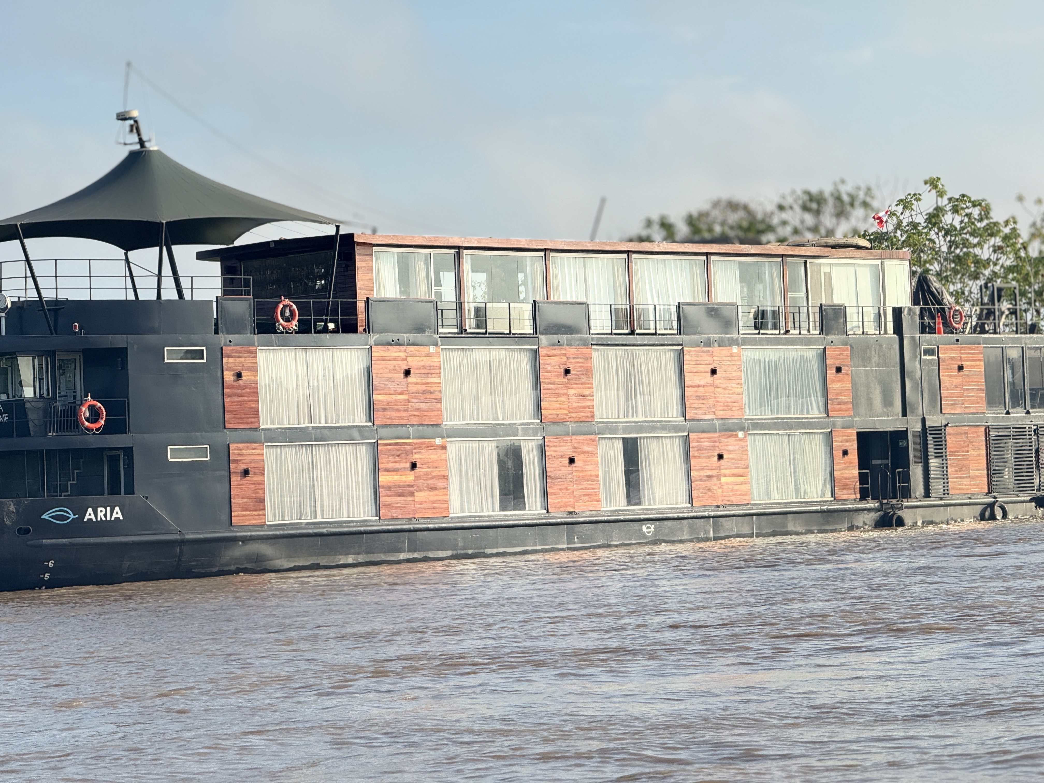 As we approached our cruise “hotel” on the Amazon, The Aria, our eyes lit up and we reached our rooms, each one with a glass wall overlooking the water and the lush land filled with greenery.