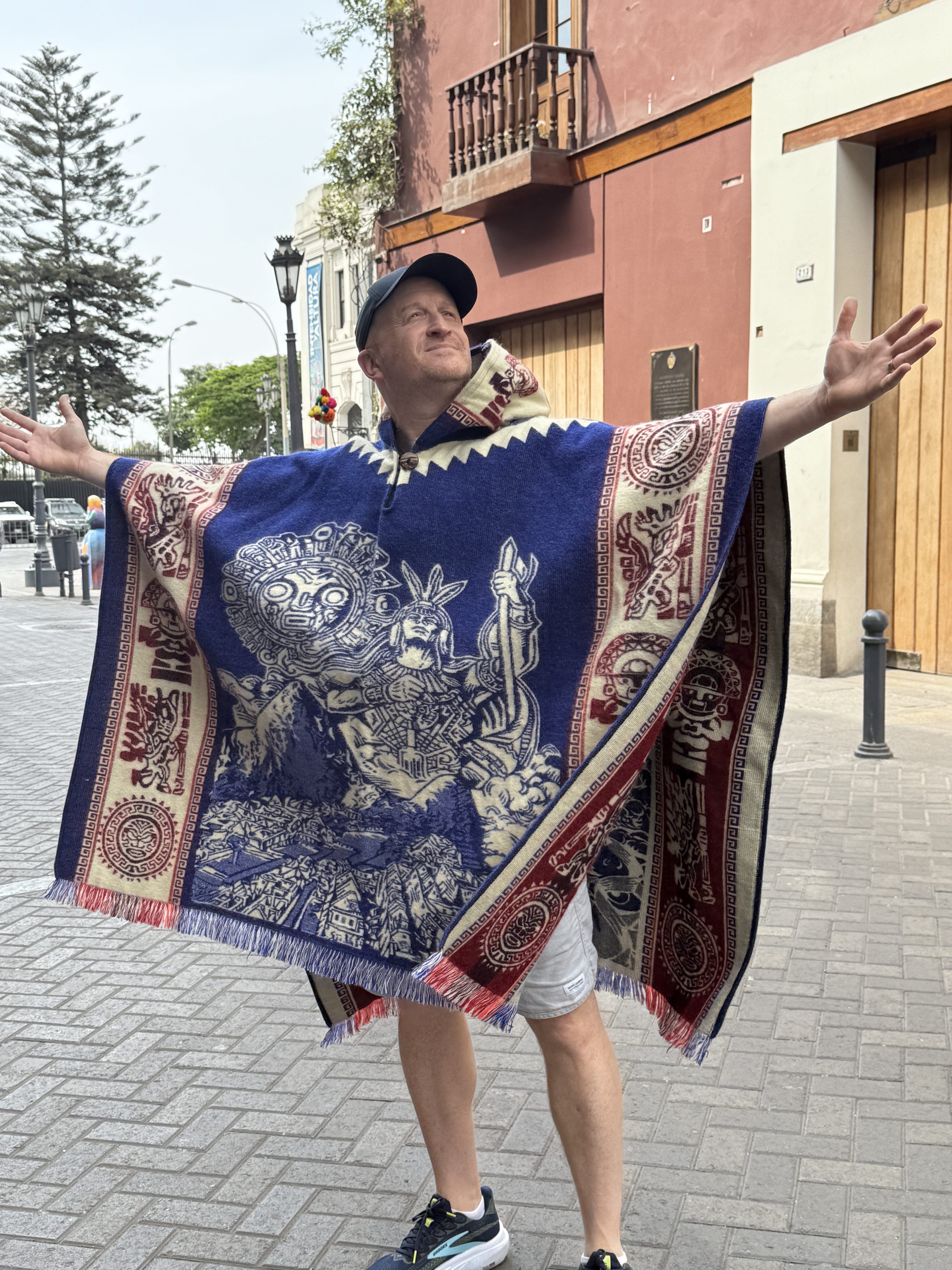 We got off the bus after our “riding tour” and walked through many neighborhoods, both rich and poor. We walked past the president’s palace and government buildings around a pretty plaza. Josh bought an impressive Inca-designed poncho that made us all laugh — he was emperor for a day!