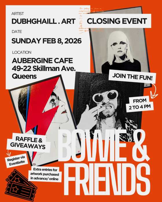 The solo exhibition, located at 49-22 Skillman Ave. in Sunnyside, is curated by Raluca Anchidin and features the work of dubhghaill.art, a Dublin native named Gareth Doyle, who resides in Sunnyside, including 13 digital and traditional portraits inspired by David Bowie and the cultural icons who shared his creative orbit, including Debbie Harry, Kurt Cobain and John Lydon.