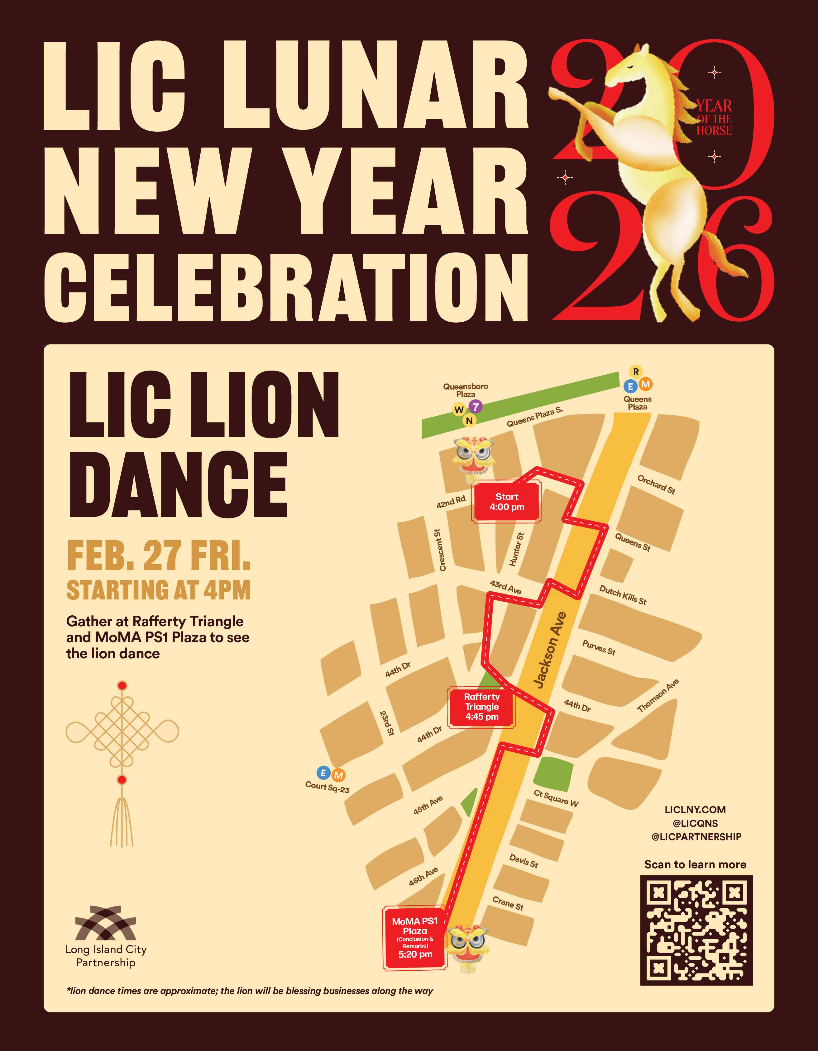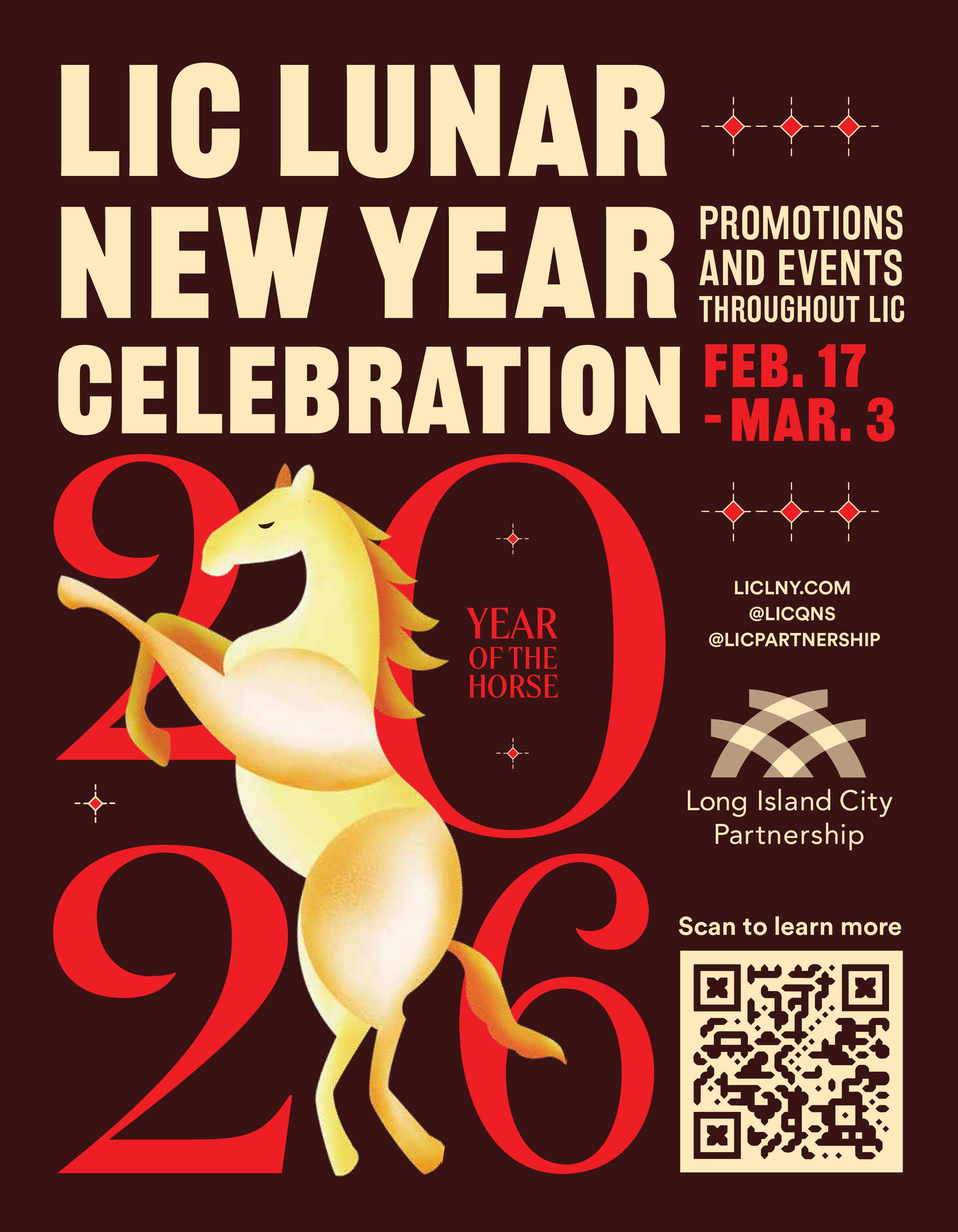 Celebrating the Year of the Fire Horse, the campaign will honor the fast-growing Asian and Asian American community in Long Island City through events and promotions in the neighborhood. More than 50 Lunar New Year-themed events and promotions will be held by local businesses throughout the two-week celebration. These will include cultural performances, special menu offerings and more. More information about the events and promotions can be found at LICLNY.com.