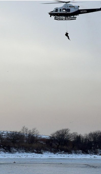 An FDNY diver and another first responder fell into the icy waters before an NYPD rescue chopper pulled the 22-year-old men from the bay individually, after they were tethered to a hoist and lifted out of the icy water. The third victim was in the water for nearly 40 minutes. All three were conscious and alert, officials said.
