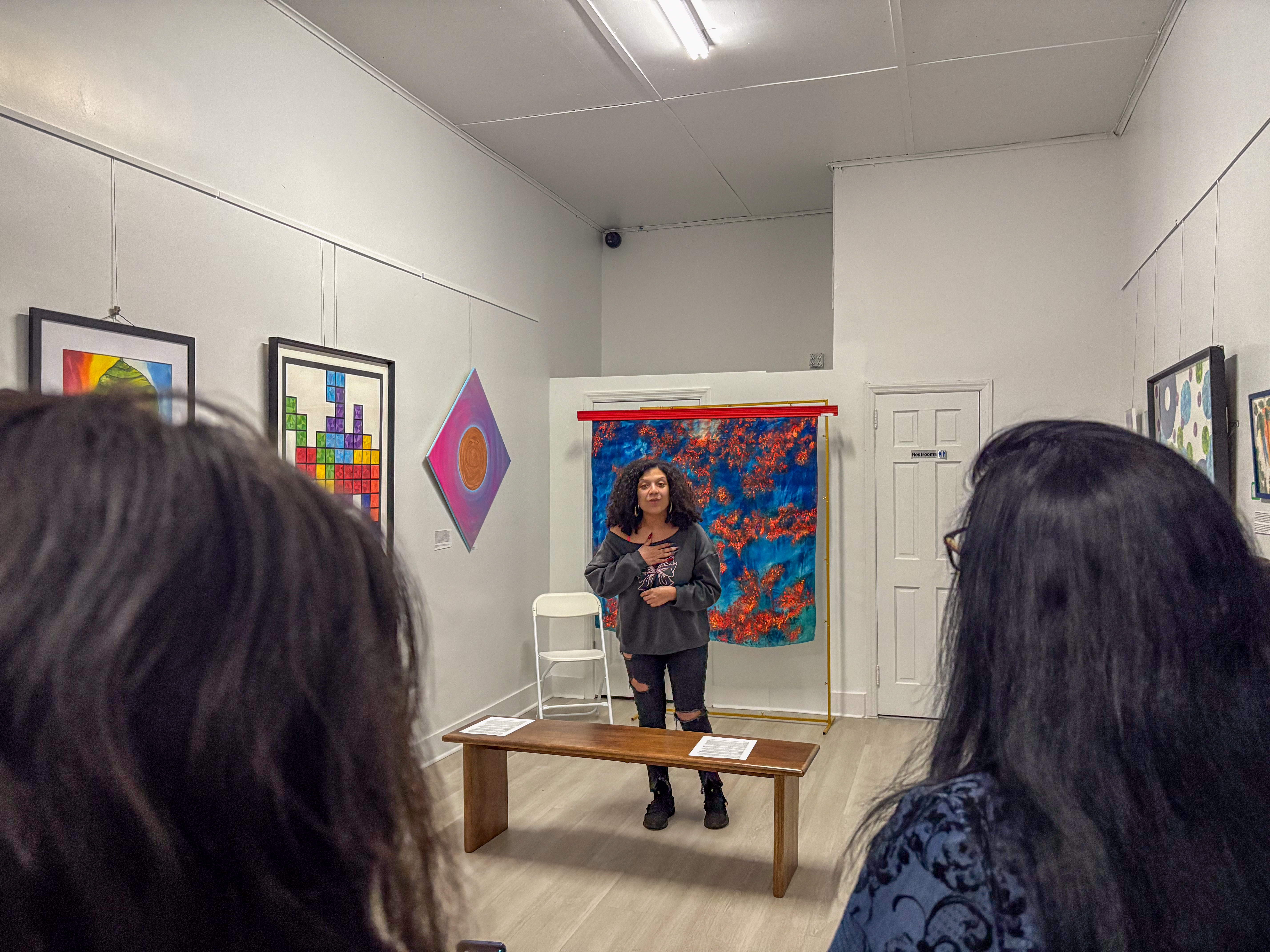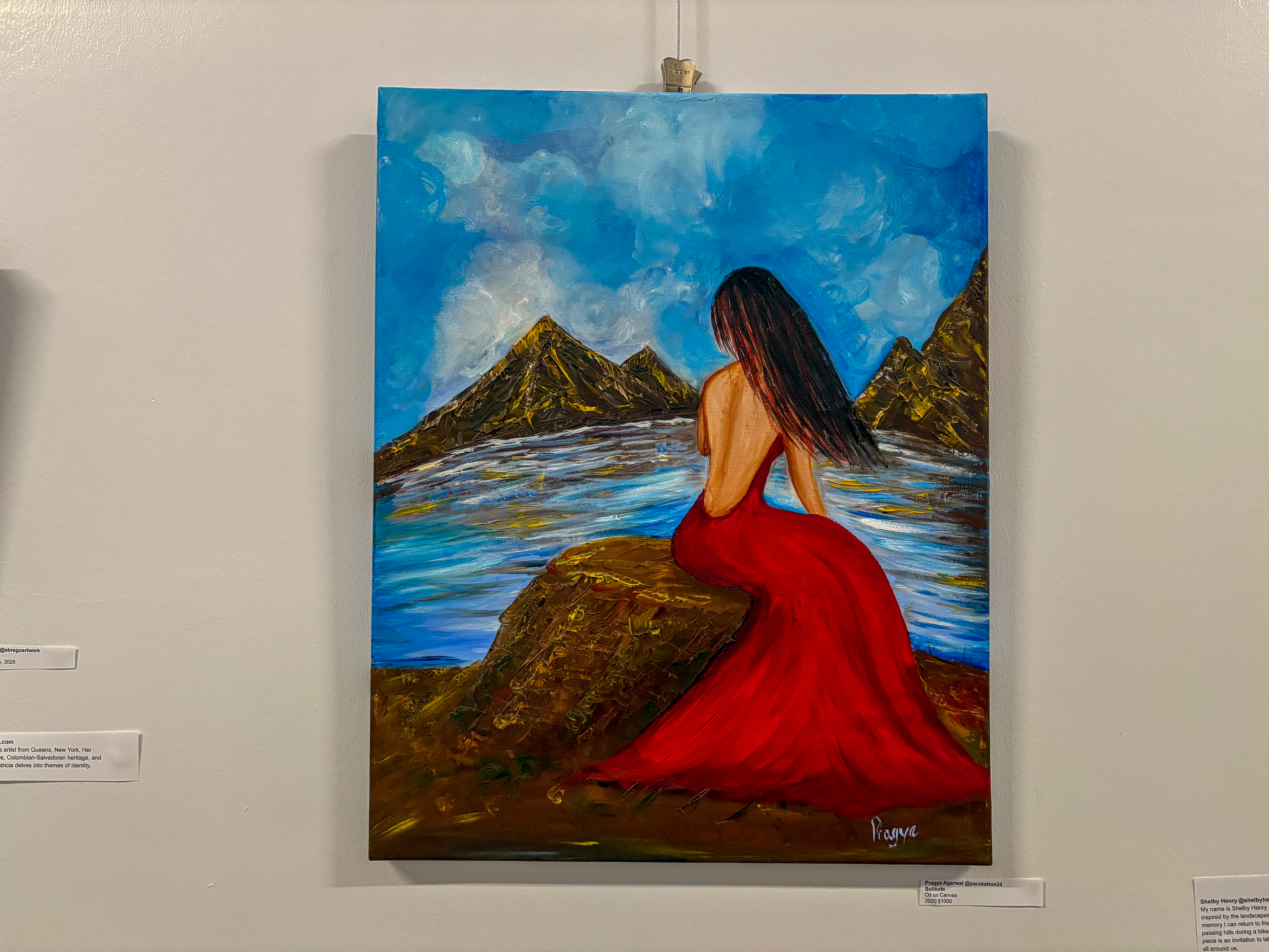 Various artisans not only expressed their vulnerability through artwork but also encouraged viewers to find love within themselves. Agarwal, a Queens-based craftswoman, described her canvas, “Solitude,” as a personally significant piece that viewers may resonate with.
