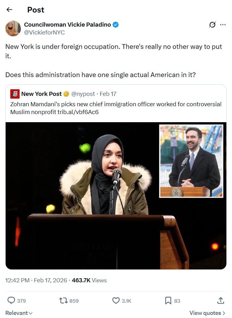 New York City Councilwoman Vickie Paladino is once again in the hot seat as the City Council Ethics Committee charged her with disorderly behavior on March 3 for Islamophobic tweets she posted on her X account, one of which was directed at Mayor Zohran Mamdani’s chief immigration officer appointee, Linda Sarsour.