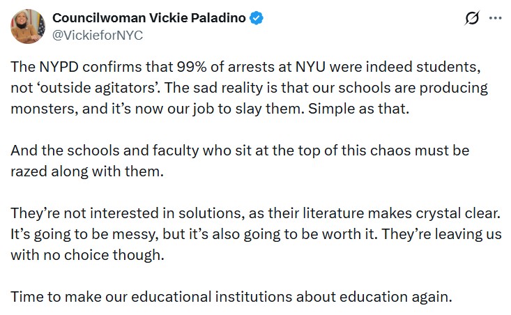 Paladino’s team has not responded to QNS’s request for further comment as of press time, but the councilwoman responded to the charges Tuesday evening on X, calling them an “unconstitutional scheme to violate [her] first amendment rights.”