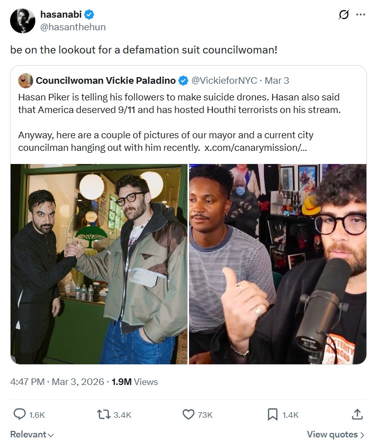Piker swiftly responded to Paladino’s accusations on X saying, “be on the lookout for a defamation suit councilwoman!” just hours before she posted in response to the ethics committee charges.
