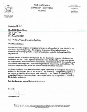 Assemblywoman Catherine Nolan’s Sept. 18 letter to Mayor Bill de Blasio opposing the 44th Drive development in Long Island City.