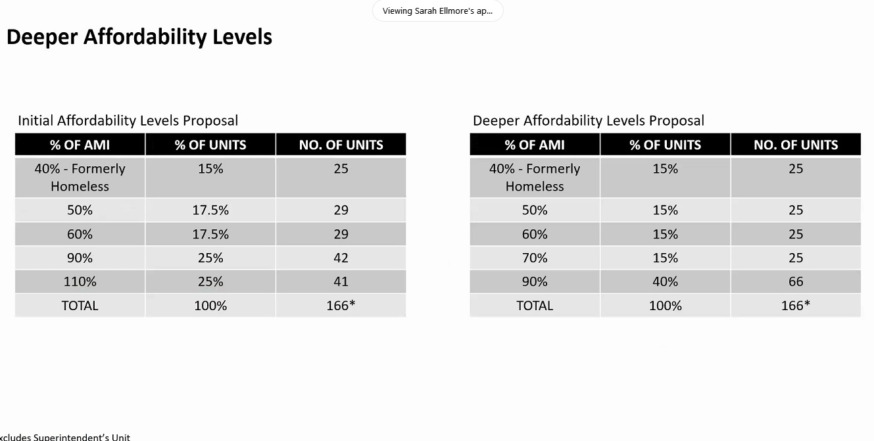 The income levels for the affordable units were adjusted, with the top income band reduced from 110 percent of the Area Median Income to 100 percent.