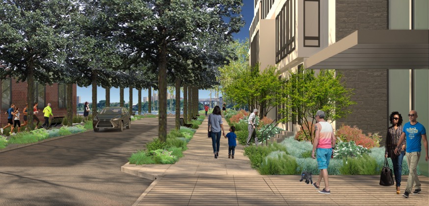 The project, which is being designed by Studio V Architecture and Ken Smith Workshop, would also transform 40,000 square feet of industrial space into a public waterfront promenade, which would be accessible through a new road at 3rd Street.