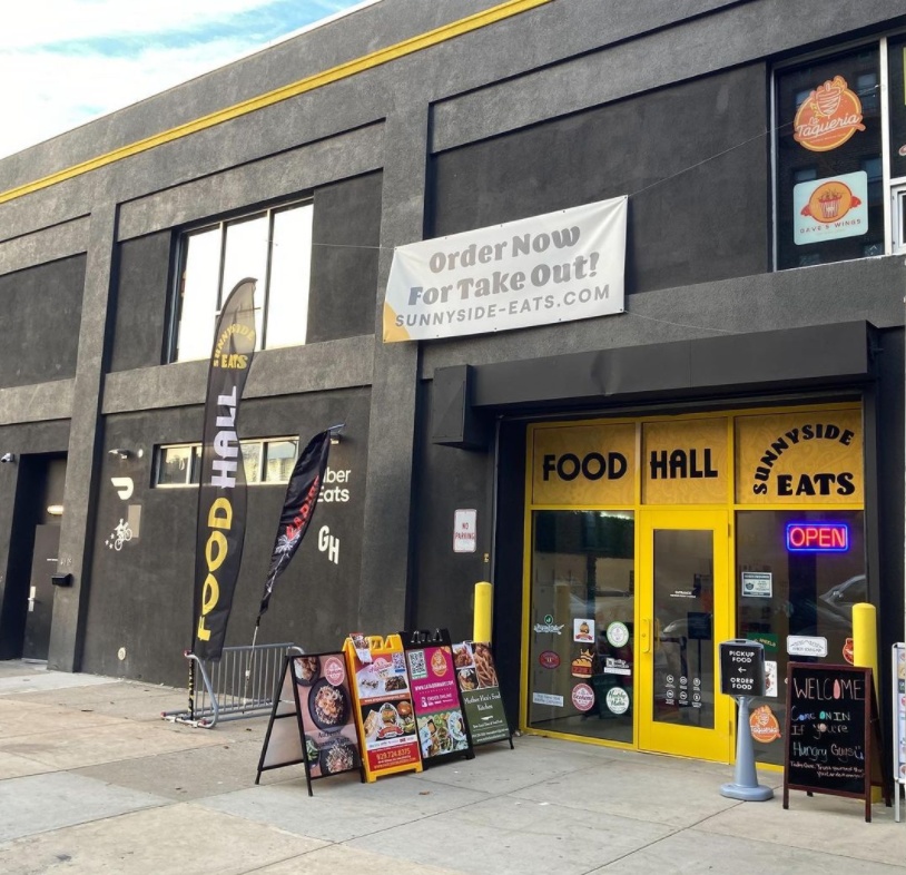 Customers can go online or use food apps–such as Door Dash, UberEATS and GrubHub–to place orders from any of the eateries operating inside the facility. Residents can also order via a kiosk inside Sunnyside Eats. All orders are available for delivery or to-go only.