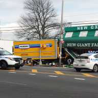 Police said a school bus with nearly 30 children on board suddenly lost control and struck a Penske truck parked outside the New Giant Farm fruit store at 211-14 Hillside Ave.