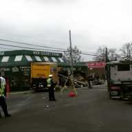 The impact caused the truck to mount the sidewalk and strike the fruit stand, causing structural damage to the building and an awning to collapse onto a pedestrian.