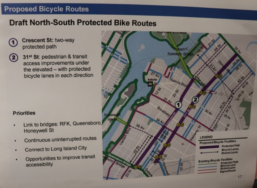 The Department of Transportation presented plans for a comprehensive bicycle network at an Astoria public meeting Tuesday night that featured two protected bike-lane routes that will go north south.