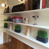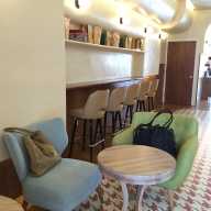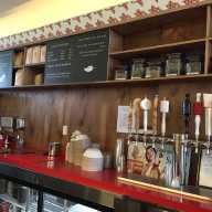 Its interior, referred to as following a “Googie-style architecture” as seen in “The Jetsons,” features plush lime green and sky blue arm chairs, and high-top chairs lining the wall-mounted bar. The site is decorated with bags of the shop’s signature coffee, wheat-grass planters, and retro memorabilia.
