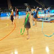 During their routine on the court, the girls performed intricately choreographed dance moves with hoops, ribbons and ropes, to the delight of the Madison Square Garden crowd.