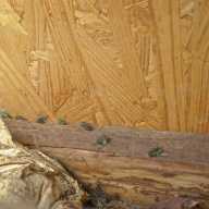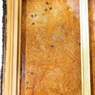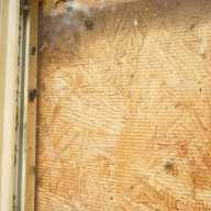 Plywood panels abut the windows and doors from the inside to keep trespassers out. However, it hasn’t stopped the flies from getting in.