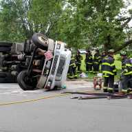 EMS treated the driver on scene for minor injuries. At this time, it is not immediately clear what caused the truck to overturn.